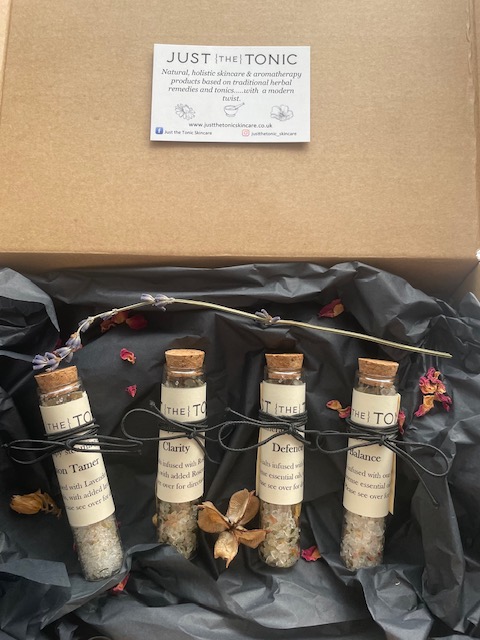 TENSION TAMER– Epsom salts and Sea salts infused with Lavender, Orange & Chamomile pure essential oils, with added Lavender & Chamomile flowers.